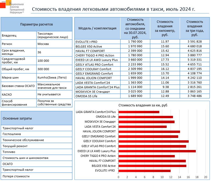 Маркетинговое агентство НАПИ (Национальное Агентство Промышленной Информации) проанализировало во сколько обходится владение различными автомобилями таксопаркам за три года эксплуатации. Стоимость владения рассчитывалась для бензиновых автомобилей и электромобилей.