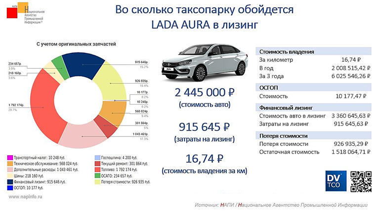 Маркетинговое агентство НАПИ рассчитало стоимость владения автомобилем LADA AURA Status в такси. Расчет выполнен с использованием онлайн калькулятора стоимости владения DV – TCO.