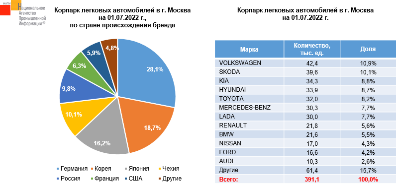 Согласно данным НАПИ (Национальное Агентство Промышленной Информации) корпарк легковых автомобилей в г. Москва на 01.07.2022 г. насчитывает 391,1 тыс. ед. Пока доля китайских автомобилей у корпоративных владельцев Москвы небольшая - всего 1,2%. В основном корпарки состоят из немецких, корейских и японских автомобилей, их совокупная доля достигла 63%. Самым популярным брендом у корпоративных клиентов Москвы стал VOLKSWAGEN.