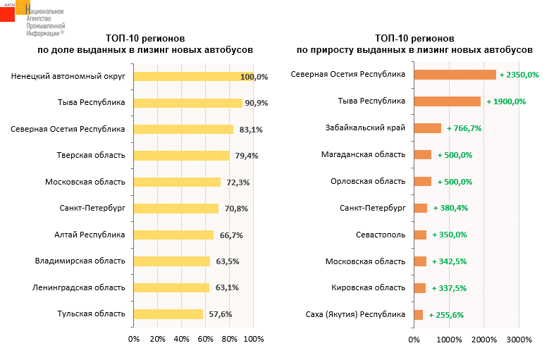 По данным маркетингового агентства НАПИ за семь месяцев 2024 года в лизинг было выдано 3,6 тыс. новых автобусов, что на 20% меньше, чем годом ранее. Тем не менее, в 30 регионах динамика выдачи в лизинг новых автобусов была положительной. По приросту поставленных в лизинг новых автобусов лидировали Республика Северная Осетия и Республика Тыва. В структуре продаж новых автобусов доля лизинга по итогам января-июля текущего года составила 31%. В тридцати регионах эта доля была выше.