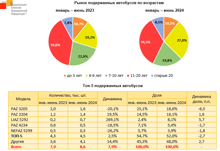 По данным маркетингового агентства НАПИ, продажи подержанных автобусов в первом полугодии 2024 года выросли на 7,9%. Первое место по объему продаж на рынке занимают автобусы возрастом 11-20 лет, но по итогу первого полугодия их доля сократилась на 5,3 п.п. за счет существенного снижения спроса. Кроме того снизились продажи автобусов возрастом 7-10 лет, что также привело к сокращению их доли. На рынке подержанной техники существенно выросла доля автобусов возрастом 4-6 лет благодаря рекордному росту продаж (+51,2%).