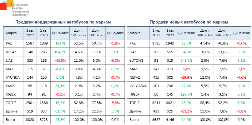 По данным маркетингового агентства НАПИ, за первый квартал 2023 года продажи новых автобусов выросли на 14% по сравнению с первым кварталом 2022 г., продажи подержанных автобусов – на 23,3%. На рынке новой и подержанной техники лидируют автобусы PAZ. За год доля китайских автобусов в продажах новой техники выросла с 4,4% до 13,2%. Продажи новых китайских автобусов по итогам первого квартала текущего года выросли на 245%.