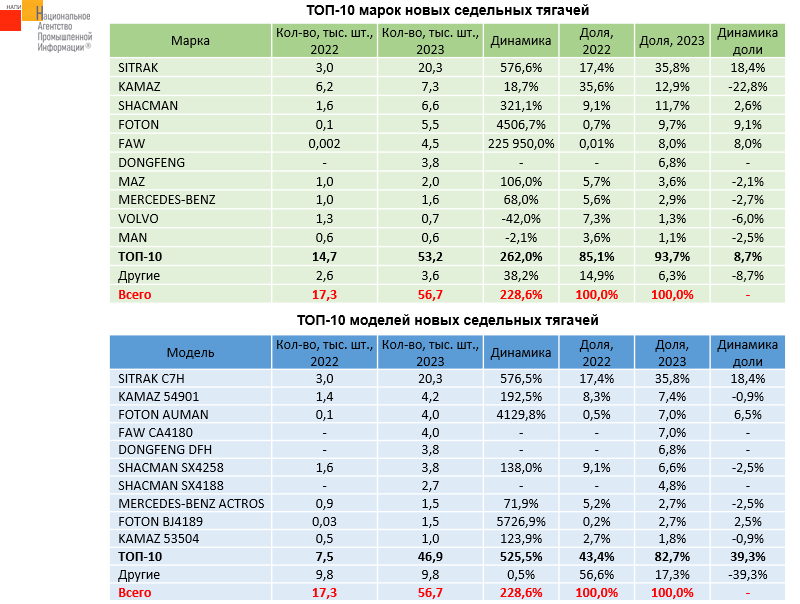 По данным маркетингового агентства НАПИ, рынок новых седельных тягачей по итогам 2023 года вырос на 228,6%. Всего за прошлый год было продано 56,7 тыс. новых седельных тягачей. Интересно отметить, что не смотря на санкции, в десятку лидеров вошло три европейских бренда - MERCEDES-BENZ, VOLVO, MAN. При этом продажи тягачей MERCEDES-BENZ в прошлом году даже выросли на 68% по сравнению с 2022 г.