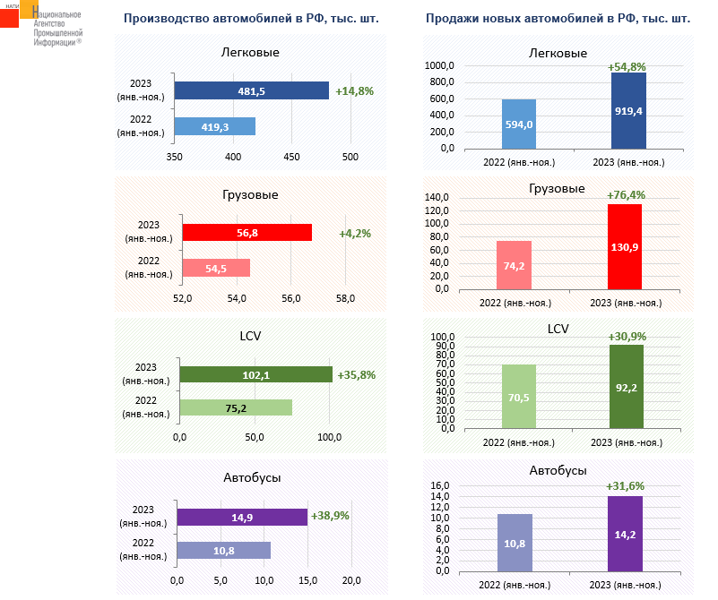 Маркетинговое агентство НАПИ проанализировало данные по производству и продажам новых автомобилей за 11 месяцев 2023 г. Производство легковых автомобилей по сравнению с январем-ноябрем прошлого года выросло на 14,8%, тогда как рынок легковых автомобилей - на 54,8%. Продажи новых грузовиков взлетели на 76,4%, производство же грузовой техники выросло на 4,2%. Такая ситуация в сегментах легковых и грузовых автомобилей вызвана в первую очередь бурным ростом импорта китайской техники. В сегменте LCV и в сегменте автобусов производство росло быстрее продаж.