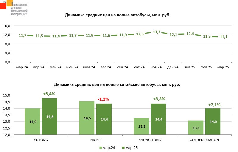 По данным маркетингового агентства НАПИ, средняя цена на новые автобусы* за год, с марта 2024 по март 2025 года, снизилась на 5% до уровня 11,1 млн. руб. Годом ранее, в марте 2024 года, средняя цена на новые автобусы составляла 11,7 млн. руб.