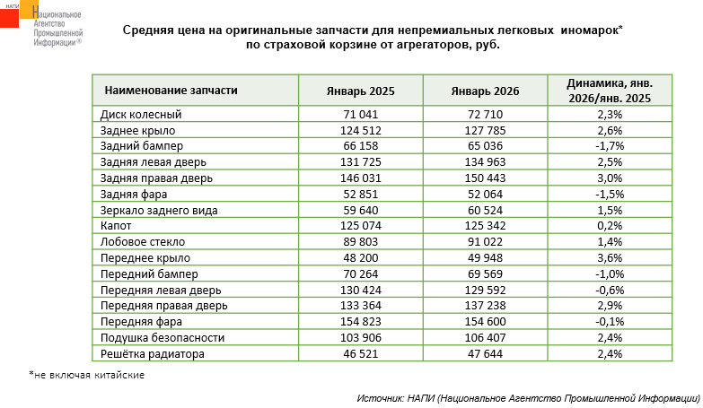 Маркетинговое агентство НАПИ проанализировало средние цены на оригинальные запчасти по страховой корзине для непремиальных иномарок* от агрегаторов.