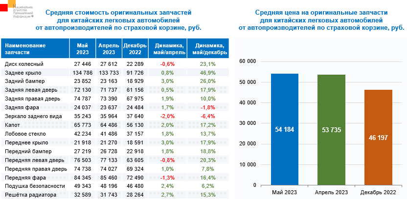 Средняя цена на запчасти для китайских автомобилей в мае 2023 года по сравнению с апрелем выросла на 0,8%, по сравнению с декабрем 2022 г. – на 17,3%.