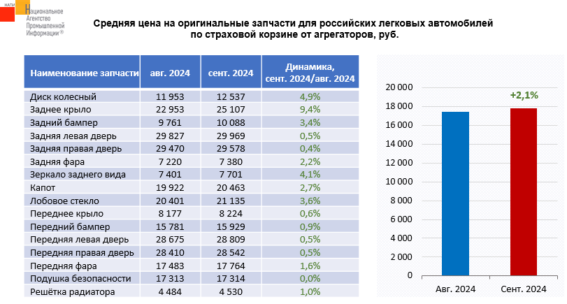 Маркетинговое агентство НАПИ проанализировало цены на оригинальные запчасти по страховой корзине для российских легковых автомобилей LADA и UAZ от агрегаторов. В сентябре 2024 года по сравнению с августом текущего года средняя цена на оригинальные запчасти выросла на 2,1%.