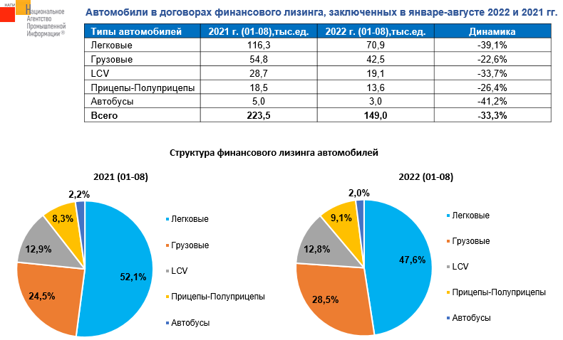 Согласно данным НАПИ (Национальное Агентство Промышленной Информации) за 8 месяцев 2022 г. в финансовый лизинг было выдано 149,0 тыс. автомобилей, что на 33,3% меньше, чем за аналогичный период прошлого года. Положительным моментом стало то, что разрыв по сравнению с прошлым годом сокращается. Так по итогам семи месяцев текущего года отставание составляло 40,7%.