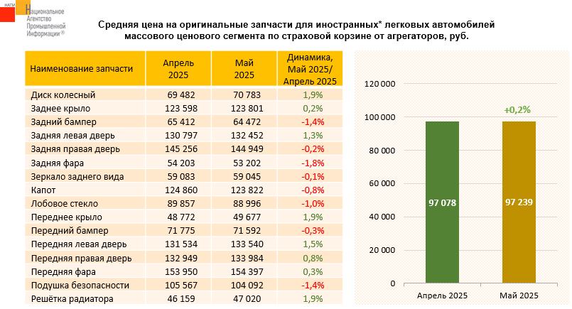 Маркетинговое агентство НАПИ проанализировало цены на оригинальные запчасти по страховой корзине для иностранных* легковых автомобилей массового ценового сегмента от агрегаторов. В мае 2025 года по сравнению с апрелем 2025 года средняя цена на оригинальные запчасти подросла на 0,2%.