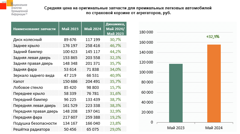 За год, с мая 2023 года по май 2024 года, средняя цена на оригинальные запчасти выросла на 32,9%.
