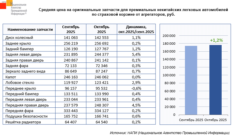Маркетинговое агентство НАПИ проанализировало цены на оригинальные запчасти по страховой корзине для премиальных некитайских легковых автомобилей от агрегаторов. За месяц, с сентября 2025 года по октябрь 2025 года, средняя цена на оригинальные запчасти выросла на 1,2%. Значительнее всего цены повысились на заднюю левую дверь (5,4%), переднюю правую дверь (4,5%) и лобовое стекло (2,9%). Несколько снизилось в цене переднее крыло (-0,6%). Стабильной осталась средняя цена на капот.