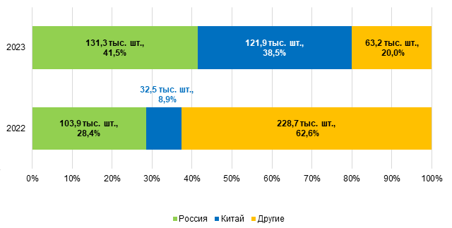 В связи с уходом большинства автомобильных брендов существенно изменилась и структура рынка. С одной стороны, выросла доля российской техники с 28,4 до 41,5%. С другой стороны, еще более впечатляющими темпами выросла доля китайских брендов – с 8,9% до 38,5%. Рост продаж «в штуках» выглядит еще более впечатляющим, на упавшем рынке «китайцы» нарастили продажи на 89,4 тыс. шт.
