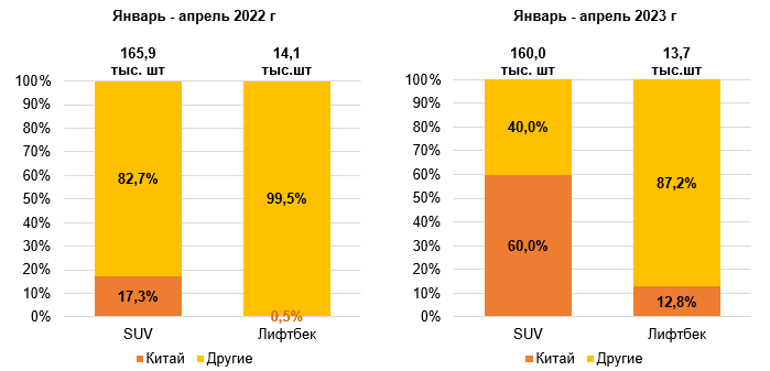 На рынке легковых автомобилей доля китайских брендов за год выросла до 40%, в первую очередь «китайцы» осваивают сегмент автомобилей SUV, где по итогам четырех месяцев 2023 года они заняли 60%.
