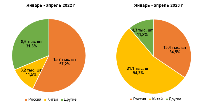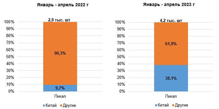 Рынок новых легких коммерческих автомобилей долгое время был не очень интересен китайским производителям, по итогам 4 месяцев прошлого года они заняли всего 1%. За год доля китайских брендов увеличилась не так сильно, по итогам января-апреля текущего года она достигла 7,4% рынка. В основном на российский рынок поставляются пикапы, в структуре продаж новых пикапов «китайцы» заняли 38,1% в текущем году.