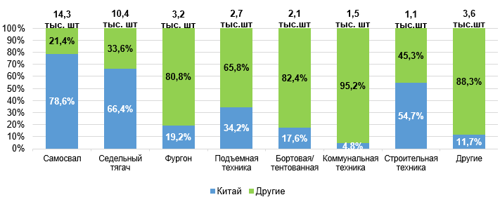 Самых существенных успехов китайские автопроизводители добились в сегменте грузовых автомобилей, где по итогам четырех месяцев текущего года они заняли 54,3% рынка, отобрав пальму первенства у российских производителей. Примечательно, что на рынке новых самосвалов доля «китайцев» достигла уже 78,6%. На рынке тягачей, где китайской техники не было до 24 февраля 2022 г., они заняли 66,4%.