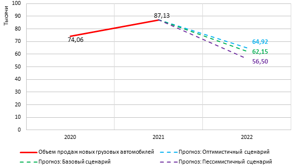 Согласно базовому сценарию прогноза, продажи новых грузовых автомобилей в 2022 г. снизятся на 28,67% по сравнению с 2021 г. и составят 62,15 тыс. ед. По оптимистичному сценарию сокращение продаж составит 25,49%, будет продано 64,92 тыс. новых грузовых автомобилей. По пессимистичному сценарию продажи сократятся на 35,15% до 56,50 тыс. ед.