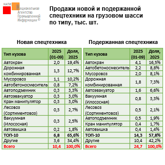 По данным НАПИ, за январь-сентябрь 2025 года было реализовано 10,4 тыс. единиц новой и 24,7 тыс. единиц подержанной спецтехники на грузовом шасси*. Наибольшая доля продаж среди новой спецтехники приходится на автокраны (19,4%), дорожную комбинированную технику (12,7%) и мусоровозы (10,2%). На ТОП-10 приходится более 65% продаж новой техники…