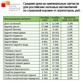 По данным НАПИ, за месяц, с октября по ноябрь 2025 года, средняя цена на оригинальные запчасти для российских легковых автомобилей LADA и UAZ сократилась на 0,1%. Так, снизилась стоимость задней фары (-4,4%) и колесного диска (-3,6%). При этом выросли в цене заднее крыло (+1,3%), зеркало заднего вида (+1%) и лобовое стекло (+0,4%)…
