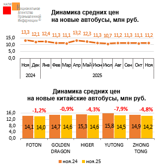 По данным НАПИ, средняя цена на новые автобусы* за год, с ноября 2024 по ноябрь 2025 года, сократилась на 2 млн рублей (-15,3%). За месяц, с октября по ноябрь 2025 года, средняя цена подросла на 1,1% до 11,2 млн. рублей. За год сократились средние цены на новые автобусы ряда китайских брендов. Так, стоимость YUTONG снизилась на 7,9%, ZHONG TONG – на 4,8%, HIGER – на 4,3%…