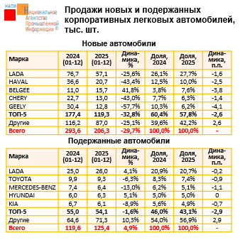По данным НАПИ, за январь-декабрь 2025 года корпоративным клиентам было продано 331,7 тыс. легковых автомобилей. Из них 206,3 тыс. ед. были новыми и 125,4 тыс. ед. – подержанными. За год продажи новых автомобилей сократились на 29,7%. Продажи ТОП-5 марок среди новых корпоративных автомобилей снизились на 32,8% …