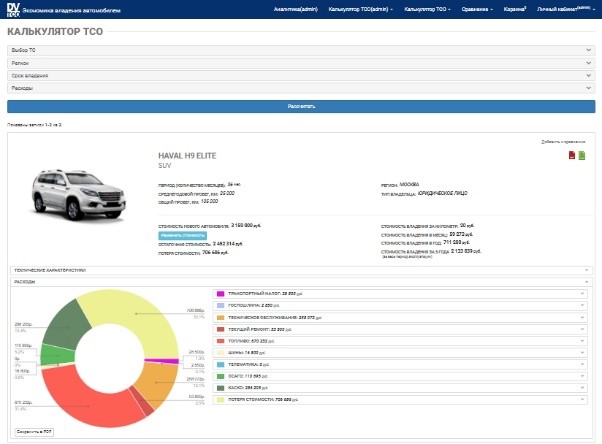 подробная детализация всех видов расходов: от технического обслуживания и телематики до лизинга и потери стоимости, возможность исключать необязательные расходы из расчета