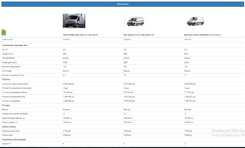расчет и сравнение ТСО для моделей конкурентного ряда с аналогичными техническими характеристиками и одинаковыми условиями эксплуатации (среднегодовой пробег, регион и т.д.)