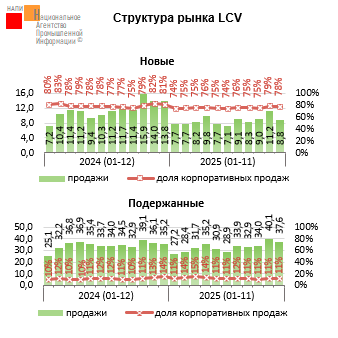 Маркетинговое агентство НАПИ проанализировало динамику продаж новых и подержанных LCV* частным и корпоративным клиентам. Всего за январь-ноябрь 2025 г. было продано 455,4 тыс. автомобилей, что на 9,1% меньше, чем за аналогичный период 2024 г. Из них было реализовано 94,6 тыс. ед. новых (-23,8% по сравнению с 2024 г.) и 360,8 тыс. ед. – подержанных (-4,3%)…
