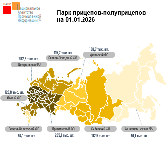 По данным НАПИ, в парке прицепов и полуприцепов на 01.01.2026 г. насчитывается 1,1 млн единиц техники. Больше всего техники расположено в Центральном ФО (282,8 тыс. ед.) , на его долю приходится больше четверти парка прицепов и полуприцепов страны. Почти 20% парка эксплуатируется в Приволжском ФО (205,1 тыс. ед.) …