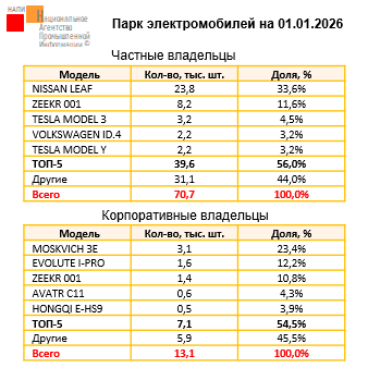 По данным НАПИ, в парке электромобилей на 01.01.2026 насчитывается 83,8 тыс. ед. автомобилей. Из них 70,7 тыс. принадлежат частным владельцам, а 13,1 тыс. – корпоративным. Самой популярной моделью у частных владельцев стал NISSAN LEAF…