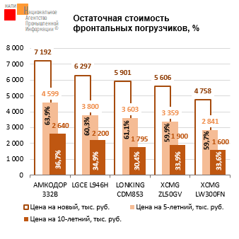 По данным НАПИ, в 3 квартале 2025 г. из представленных на графике 5-летних и 10-летних фронтальных погрузчиков дороже можно было продать АМКОДОР 332В, средняя цена которого составляла 4,6 млн рублей и 2,6 млн рублей соответственно. Также АМКОДОР 332В стал лидером по сохранности остаточной стоимости через 5 лет и 10 лет эксплуатации …