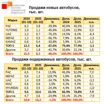 По данным маркетингового агентства НАПИ, за январь-октябрь 2025 года было реализовано 8,3 тыс. ед. новых и 14,2 тыс. ед. подержанных автобусов. За год продажи новой техники сократились на 46,6%. Ниже рынка упали продажи LIAZ (-70,2%) и NEFAZ (-56,7%). Чуть меньше сократились продажи PAZ, YUTONG и KAMAZ, а их доля выросла до 45,5%, 12,9% и 5,1% соответственно…