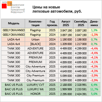 Маркетинговое агентство НАПИ проанализировало рекомендованные розничные цены (РРЦ) на новые легковые автомобили в сентябре 2025 г. По сравнению с августом текущего года изменились цены на 46 комплектаций. Снизились цены на 28 комплектаций моделей GEELY, TANK, HONGQI, JAECOO, WEY и SOLARIS. При этом цены на 18 комплектаций GEELY, BAIC, SOLARIS и BAW в сентябре выросли. Прирост составил от 0,7% до 11,7%.