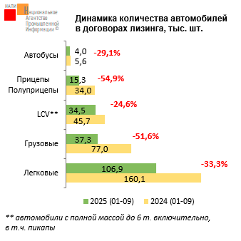 По данным НАПИ, за январь-сентябрь 2025 года в лизинг* было выдано 197,9 тыс. единиц новых и подержанных автомобилей, что на 38,6% меньше, чем годом ранее, когда было выдано 322,4 тыс. За год лизинг прицепов и полуприцепов упал на 54,9%, в результате доля этого сегмента за год сократилась на 2,8 п.п. до 7,7%. Также на 51,6% снизился лизинг грузовых автомобилей …