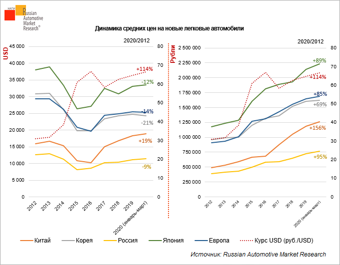 Агентство Russian Automotive Market Research провело анализ средних цен на новые легковые автомобили в России, за исключением премиальных брендов, в период с 2012 г. по март 2020 г.