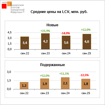 В сентябре 2025 года по сравнению с августом 2025 года средняя цена на продаваемые лизинговыми компаниями тягачи 2022 года выпуска снизилась на 8% до 3,496 млн рублей, 2023 года выпуска – на 9,9% до 4,056 млн рублей, 2024 года выпуска – на 2,1% до 5,265 млн рублей. Цена на эти же тягачи, реализуемые другими участниками рынка, в прошлом месяце составляла 3,687 млн рублей (-6,8%), 5,879 млн рублей (-1,5%) и 6,255 млн рублей (+1,4%) соответственно…