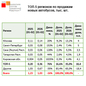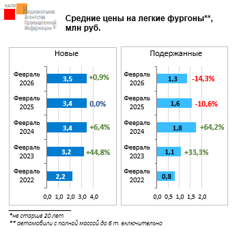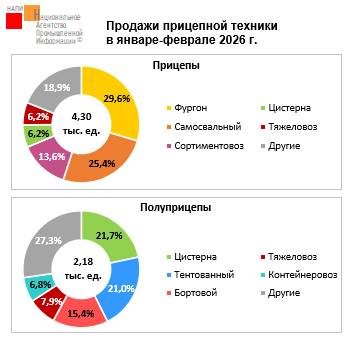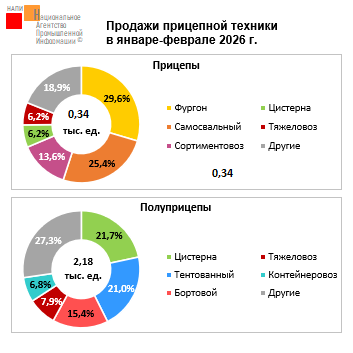 Наиболее продаваемыми прицепами стали фургон (+26,6% за год до 0,10 тыс. ед.), самосвальный прицеп (-32,3% до 0,09 тыс. ед.), сортиментовоз (-55,3% до 0,05 тыс. ед.), тяжеловоз (-47,5% до 0,02 тыс. ед.). Кроме того, в 2026 году в топ вошла цистерна (0,02 тыс. ед.), тогда как в 2025 году место в пятерке лидеров занимал рефрижератор.