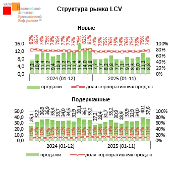 За период с января по ноябрь 2025 года доля корпоративных продаж новых LCV колебалась от 74% до 79%, подержанных – от 11% до 15%.