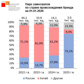Иная ситуация с техникой 2025 г.в.: доля китайских самосвалов составляет 9,4%, тогда как доля российских тягачей достигает 75,1%.