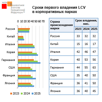 В структуре продаж новых грузовиков доля китайской техники сократилась во всех сегментах. Значительнее доля снизилась в сегментах самосвалов (-22,5 п.п.), седельных тягачей (-13,2 п.п.), строительной техники (-14,6 п.п.). Несмотря на сокращение, в 2025 г. на китайскую технику приходилось более половины продаж новых грузовиков в сегментах седельных тягачей (62,5%), строительной техники (58,5%), самосвалов (54,7%) и фургонов (50,8%).