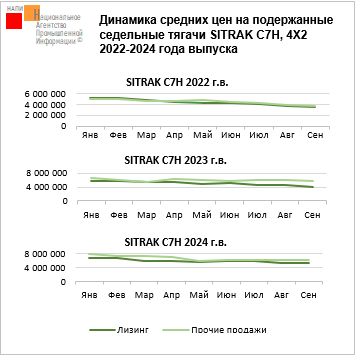 Маркетинговое агентство НАПИ проанализировало динамику средних цен на подержанные седельные тягачи SITRAK C7H, 4Х2 2022-2024 года выпуска. За девять месяцев, с января по сентябрь 2025 года, средняя цена на тягачи SITRAK C7H 2022 года выпуска, реализуемые лизинговыми компаниями, снизилась на 31,8%, 2023 года выпуска – на 30,7%, а 2024 года выпуска – на 22%. Стоимость SITRAK C7H, продаваемых дилерами, независимыми продавцами и различными владельцами техники, также снижалась: на 25,1% на тягачи 2022 года выпуска, на 9,7% на тягачи 2023 года выпуска и на 21,5% на тягачи 2024 года выпуска.