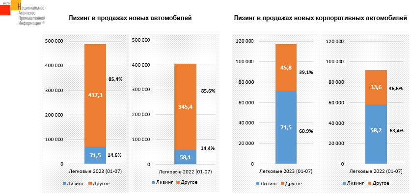 По данным маркетингового агентства НАПИ, в финансовый и операционный лизинг за 7 месяцев 2023 года было выдано 71,5 тыс. новых легковых автомобилей. Рост по сравнению с январем-июлем прошлого года составил 23%. Доля лизинга на рынке новых легковых автомобилей достигла 14,6%. В структуре же продаж новых автомобилей корпоративным клиентам доля лизинговых поставок достигла 60,9%.