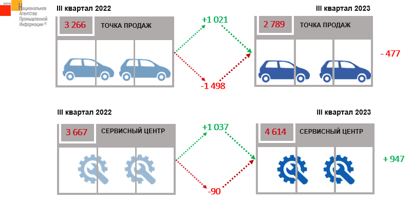 Маркетинговое агентство НАПИ обновило отчет по дилерским и сервисным центрам легковых автомобилей. По итогам 3 квартала 2023 г. количество СТО выросло на 947 шт. по сравнению с третьим кварталом прошлого года. Основной рост произошел за счет расширения сервисной сети китайских брендов, количество «китайских» сервисов увеличилось на 913 шт. В 3 квартале 2023 года обслуживанием китайских автомобилей занималось 1 809 СТО или 39% от всех сервисов. Количество точек продаж легковых автомобилей сократилось на 477 за счет ушедших брендов. Количество же точек продаж китайских автомобилей за год выросло на 908 шт. В 3 квартале текущего года 1 694 центра продавали китайские автомобили или 61% от всех точек продаж.