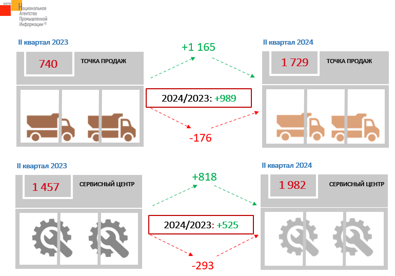 Маркетинговое агентство НАПИ обновило отчет по дилерским и сервисным центрам грузовых автомобилей по итогам 2 квартала 2024 года. По сравнению со 2 кварталом 2023 года, количество авторизованных точек продаж выросло на 989 ед. за счет массированного выхода китайских автопроизводителей. Лидерами по росту количества точек продаж стали SITRAK (+331 ед.), HOWO (+321 ед.), DONG FENG (+ 163 ед.). Общее количество точек продаж китайских грузовиков во 2 квартале 2024 г. достигло 1 468 ед., или 85% от всех авторизованных точек продаж. Количество авторизованных сервисных центров во 2 квартале 2024 г. выросло на 525 ед. У бренда SITRAK прибавилось 196 СТО, у HOWO количество сервисных станций выросло на 175 ед., у DONG FENG – на 141 ед. Всего 1 096 сервисных центров обслуживает китайские грузовики во 2 квартале 2024 года, или 55% от всех авторизованных СТО.
