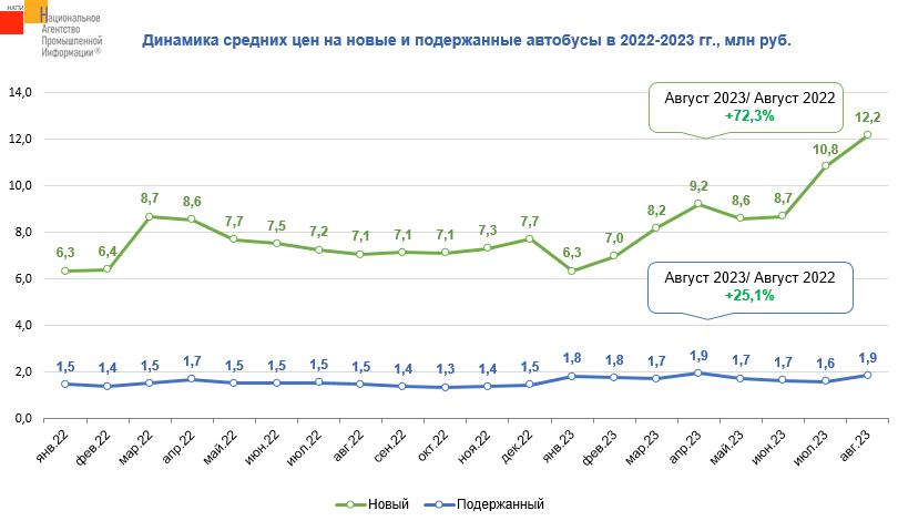 Средние цены на новые автобусы с августа 2022 г. по август 2023 г. выросли на 72,3% и достигли 12,2 млн. руб. Пик роста цен пришелся на июль-август текущего года, в первую очередь за счет значительного подорожания китайских автобусов.