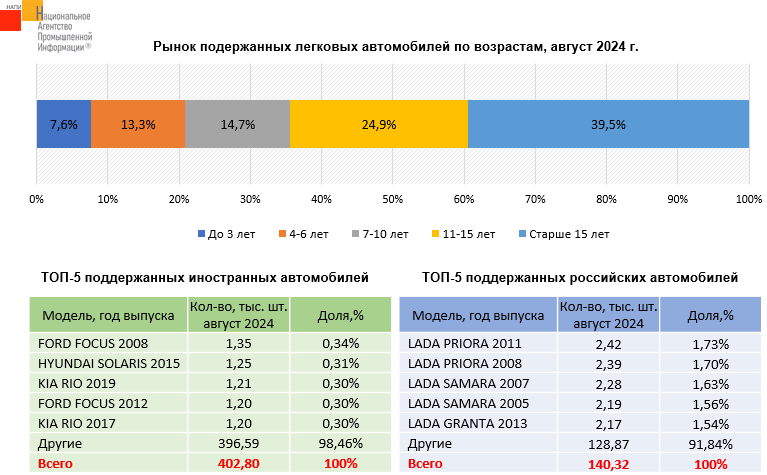 По данным маркетингового агентства НАПИ, в августе 2024 г. было продано 543,12 тыс. подержанных легковых автомобилей. Значительная часть автовладельцев выбирала технику старше 15 лет, на ее долю пришлось почти 40% рынка подержанных автомобилей. Самым продаваемым российским автомобилем в августе 2024 года стала тринадцатилетняя LADA PRIORA, самой продаваемой иномаркой – шестнадцатилетний FORD FOCUS.
