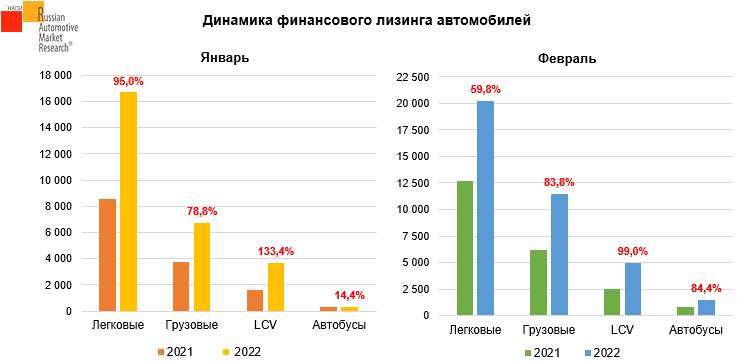 Согласно данным Russian Automotive Market Research, за первые два месяца 2022 г. количество выданных в финансовый лизинг автомобилей выросло на 80,2% по сравнению с аналогичным периодом прошлого года. За январь-февраль 2022 года по данным Федресурса было выдано 65,5 тыс. автомобилей, а в аналогичном периоде прошлого года было выдано 36,4 тыс. автомобилей.