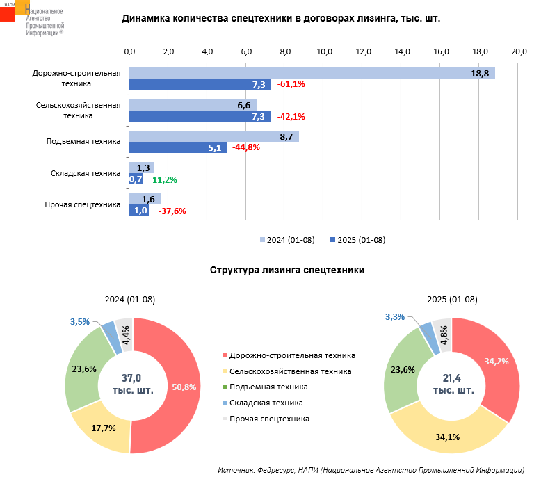По данным маркетингового агентства НАПИ, за январь-август 2025 года в финансовый лизинг было выдано 21,4 тыс. единиц новой и подержанной специализированной техники, что на 42,2% меньше, чем годом ранее, когда было выдано 37 тыс. единиц. Средний срок договора лизинга за год снизился на два месяца, в январе-августе текущего года он составил 37 месяцев.