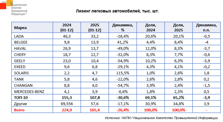 Лизинг ТОП-10 марок легковых автомобилей сократился на 30,6%, что больше чем в целом по рынку. В результате доля десятки лидеров не достигла двух третей рынка лизинговых легковых автомобилей. Рост продаж показали лишь марки BELGEE и SOLARIS. Наибольшая доля в общем объеме лизинга легковушек по итогам 2025 года приходится на марки LADA, BELGEE и HAVAL.