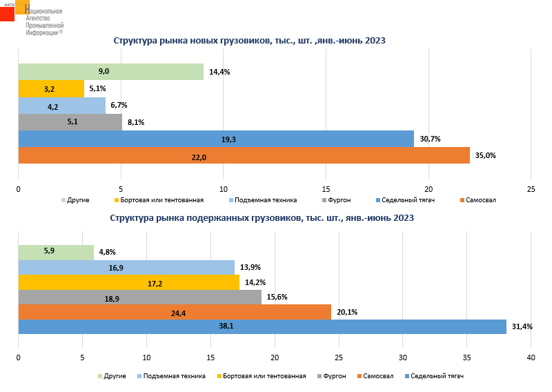 По данным НАПИ за первое полугодие 2023 г. рынок новых грузовых автомобилей вырос на 67,2%, всего было продано 62,8 тыс. грузовиков. Рынок подержанных грузовиков увеличился на 20,3%, было продано 121,4 тыс. подержанной техники. Интересно отметить, что доля тягачей в продажах новых и подержанных грузовиков почти одинаковая – 30,7% и 31,4% соответственно, хотя «в штуках» подержанных тягачей было продано в 2 раза больше. В отличии от рынка новых грузиков, на рынке подержанной техники существенно выше доля фургонов, бортовой/тентованной, подъемной техники. Самосвалы лидируют на рынке новых грузовиков, на рынке подержанных они занимают второе место.